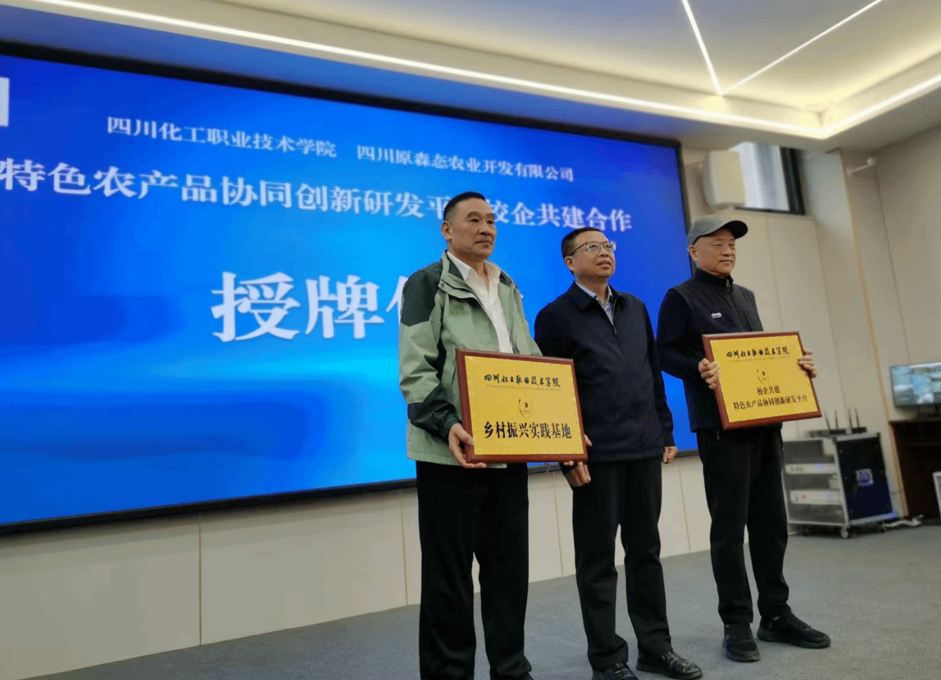 在与会人员的共同见证下,徐丽萍与陈均共同签署了《四川化工职业技术学院·四川原森态农业公司特色农产品协同创新研发平台校企共建合作协议》以及《四川化工职业技术学院·四川原森态农业公司联合举办柚香茶包装设计大赛协议》;邓启华为公司颁发了“乡村振兴实践基地”和“校企共建特色农产品协同创新研发平台”牌匾并向杨国权、陈均颁发了产业导师聘书。