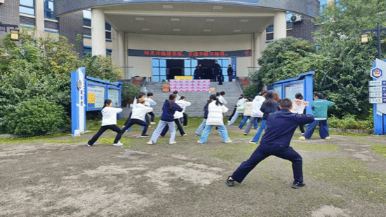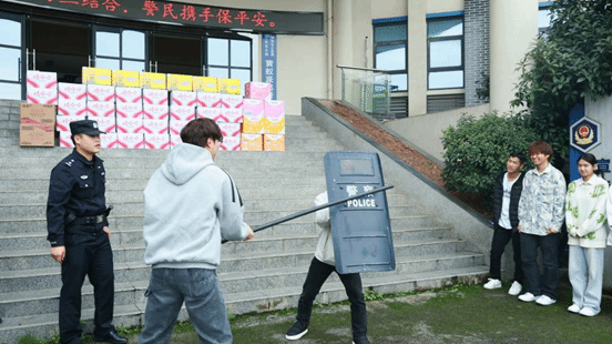最后三名警官分别介绍出警时携带的随身装备,一边现场演示操作;之后又专门演示了棍棒、护盾的实战使用技巧,最后带领学生练习擒敌拳,现场氛围十分热烈。