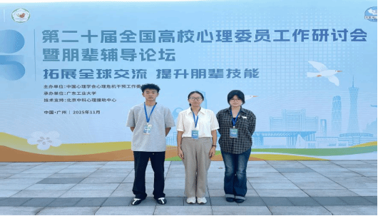 加强我校心理委员工作队伍建设,提升心理委员的自助与助人能力,我校学生心理健康教育中心贺娟老师带队参加第二十届全国高校心理委员工作研讨会暨朋辈辅导论坛,与来自全国的心理健康工作者共同探讨心理委员工作的新方法和新路径。本次研讨会由中国心理学会心理危机干预工作委员会主办,于2025年11月5日——7日在广东工业大学召开,主题是“拓展全球交流,提升朋辈技能”。