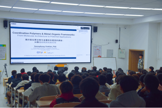 2025年11月12日,应用化工学院邀请泰国清迈大学化学系副教授、无机化学与配位聚合物领域知名学者Dr. Saranphong Yimklan为师生带来题为“揭示配位聚合物与金属有机框架的奥秘——从微观结构到实际应用”的精彩报告。讲座聚焦配位聚合物与金属有机框架的前沿研究与实际应用,吸引了应用化工技术等相关专业师生的积极参与,现场座无虚席,反响热烈。