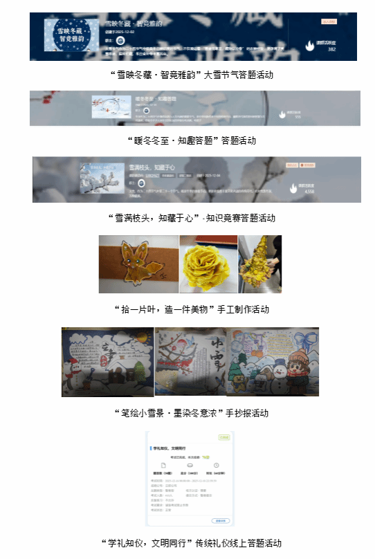 聚焦二十四节气、传统礼仪与非遗技艺,推动中华优秀传统文化融入日常。易班宣传办公室、综合事务部先后开展“雪映冬藏·智竞雅韵”大雪节气答题、“暖冬冬至·知趣答题”等系列知识竞赛,累计参与超5000人次;易班宣传办公室“拾一片叶,造一件美物”手工制作活动,传递尊重自然、热爱生活的理念;“笔绘小雪景·墨染冬意浓”手抄报活动展现节气美学;权益部开展“学礼知仪,文明同行”传统礼仪线上答题,普及拱手礼、宴饮礼等规范。