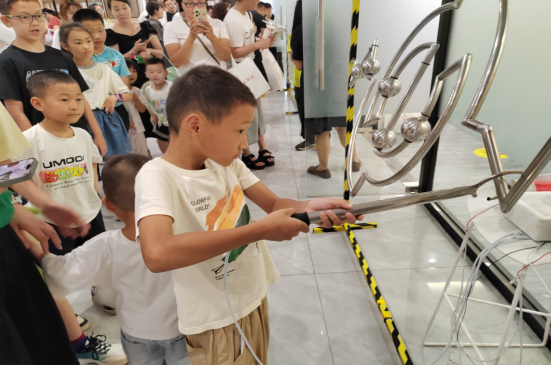 小朋友们在工作人员的指引下,转动手摇发电机,聆听发电机原理讲解;双手触碰范式起电机,体验静电带来的“怒发冲冠”现象;动手点亮磁悬浮灯泡,了解电磁感性式无线充电技术等,亲身体验电力的神奇与魅力。