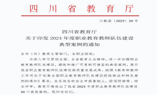 2月13日,四川省教育厅印发了《关于印发2024年度职业教育教师队伍建设典型案例的通知》(川教函〔2025〕20号),我校机械工程学院申报的案例《“标准牵引、行业引领、三室多能”,打造高素质“双师型”教师队伍》入选我省2024年度职业教育教师队伍建设典型案例。