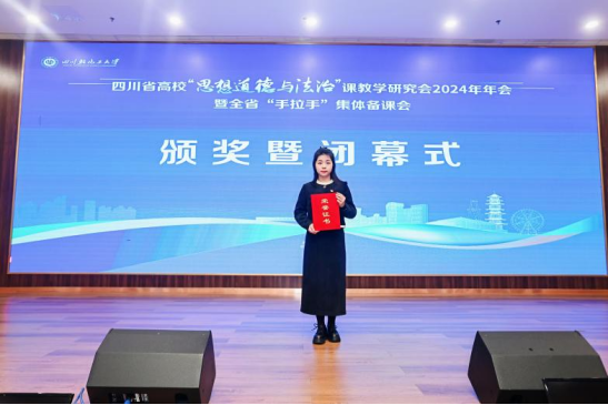 2024年12月12日—14日,由四川省教育厅指导,四川省高校“思想道德与法治”课教学研究会、全国高校思政课“手拉手”集体备课中心(四川大学-四川省)、李辽宁名师工作室主办的四川省高校“思想道德与法治”课程教学研究会2024年年会暨全省“手拉手”集体备课会在四川轻化工大学举行。学校马克思主义学院教师彭丹凭借扎实的理论功底、出彩的教学设计、精彩的现场讲授,从全省高职高专竞赛组脱颖而出,荣获教学竞赛“一等奖”的优异成绩。