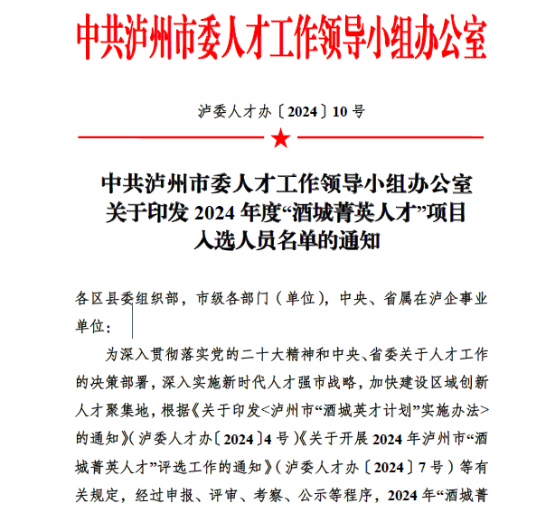 根据《关于印发< 泸州市“酒城英才计划”实施办法>的通知》(泸委人才办〔2024〕4 号)和《关于开展2024 年泸州市“酒城菁英人才”评选工作的通知》(泸委人才办〔2024〕7 号)的相关规定,泸州市通过全面而细致的选拔流程,旨在挖掘和培养一批在各自领域内具有卓越贡献和突出能力的优秀人才。