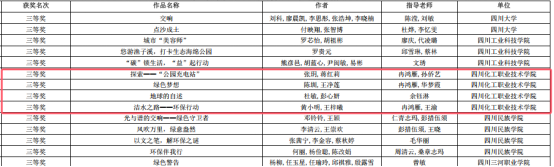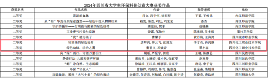 经过层层筛选与专业老师评审,10件校级优秀作品脱颖而出,代表我校参加了由四川省教育厅主办的第八届四川省大学生环保科普创意大赛。在这场更高规格的竞技舞台上,我校学子不负众望,从全省46所高校提交的309件作品中脱颖而出,荣获二等奖2项、三等奖4项,不仅展现了我校在环保教育领域的丰硕成果,更彰显了青年学子勇于探索、敢于创新的青春风采。