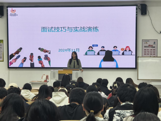 就业大讲堂涵盖了如何在面试中展现个人优势、面试实战演练、就业形势分析等实用话题,帮助同学在求职过程中更好地展示自己的优势,极大地丰富了同学的就业知识储备,使他们能够更全面地了解求职市场的现状和趋势。同时,讲座还特别注重提升同学的面试技巧和实战演练能力,帮助同学们在实际面试中更加从容不迫,展现出最佳状态,从而提高求职成功率。