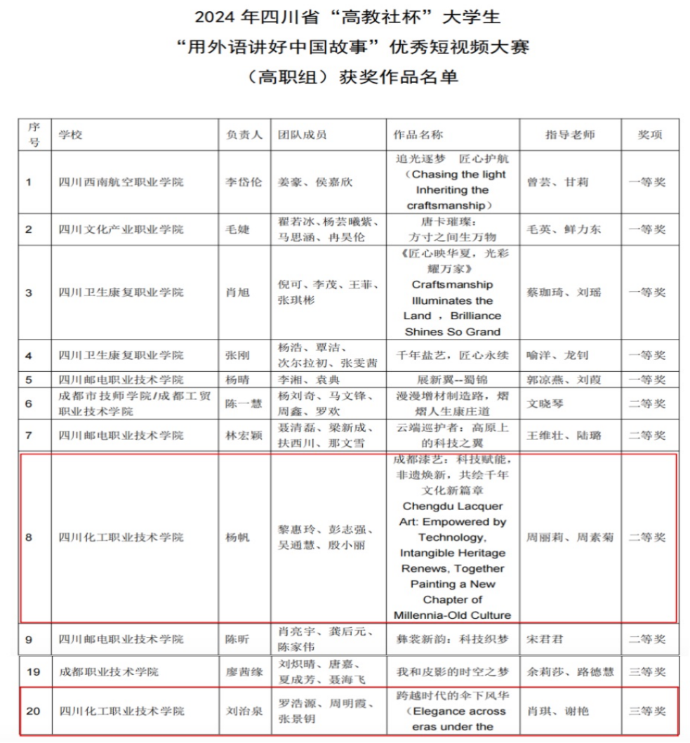10月28日,2024年四川省“高教社杯”大学生“用外语讲好中国故事”优秀短视频大赛圆满结束。我校基础教学部英语教研室周丽莉、周素菊老师指导的短视频作品《成都漆艺:科技赋能,非遗焕新,共绘千年文化新篇章》荣获高职组二等奖;肖琪、谢艳老师指导的短视频作品《跨越时代的伞下风华》荣获三等奖。