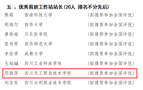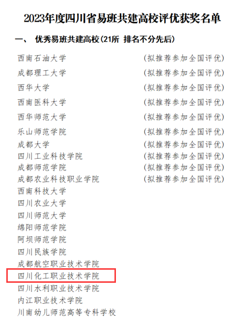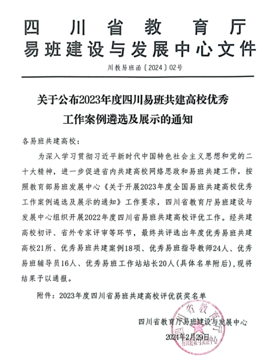 2月29日,省教育厅易班建设与发展中心公布2023年度四川省易班共建高校评优获奖名单,我校被评为“优秀易班共建高校”,这也是学校连续七年获此殊荣;学校报送的《“五个一”网络红色文化育人平台的构建与实践》被评为优秀易班共建案例(拟推荐全国评优),学生处陈善娜老师被评为“优秀易班指导教师”(拟推荐全国评优),应用化工学院精细化工2131班邓丽萍同学被评为“优秀易班工作站站长”(拟推荐全国评优)。这是自2015年开展易班共建高校优秀工作案例遴选及展示工作以来,学校连续7次被评选为“四川省优秀易班共建高校”。