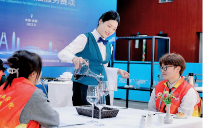 此赛项由3人组成团队,分别参加前厅接待、中餐服务、西餐服务三个模块的比赛,赛项内容涵盖了酒店管理与数字化运营专业的核心技能和相关岗位职业素养,反映了现代酒店工作的个性化服务、信息化操作、国际化趋势的特点,体现了酒店工作过程的规范化、实境化、流程化、个性化与职业化要求。