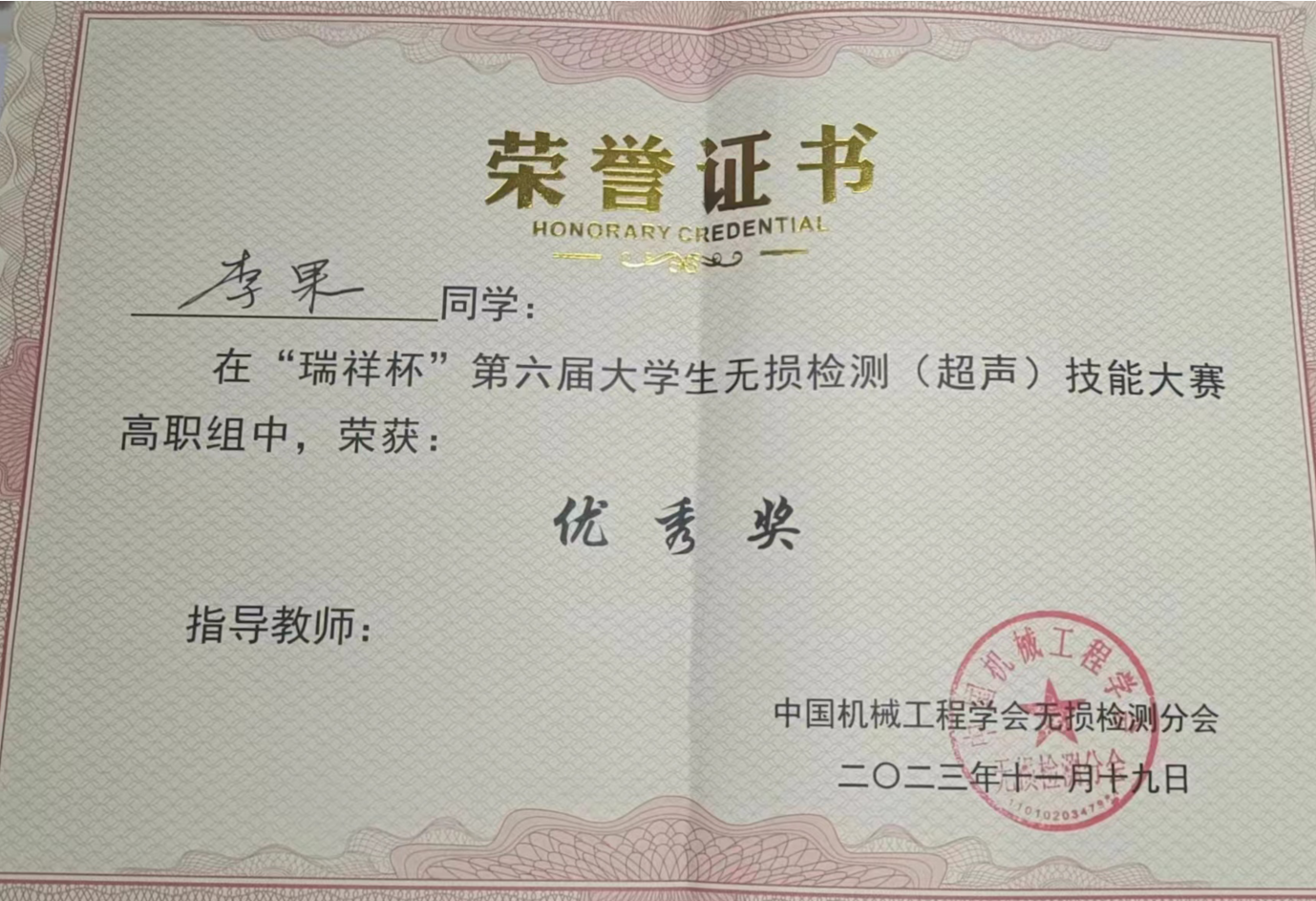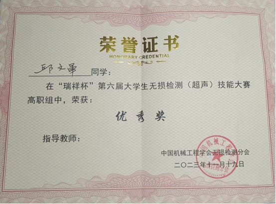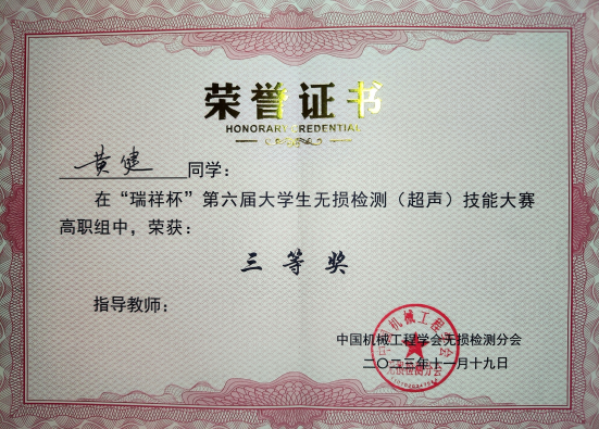2023年11月17日至19日,第六届全国大学生无损检测(超声)技能大赛在西安工程大学成功举行,来自全国的33所本、专科院校111位学生选手同台竞技。经过激烈地角逐,由我学院王非森、周林军、陈星红等老师指导的3名同学取得了优异的成绩,其中,黄健同学荣获高职组三等奖,李果、邱文军同学获得优秀奖。