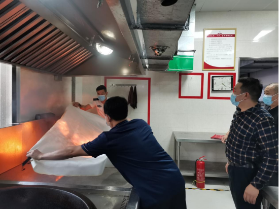 培训会后,在学校教工餐厅厨房,各食堂负责人和主厨师傅们在喻琴教官的指导下,开展了厨房灭火毯实际使用现场演练。