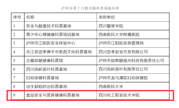 近日,泸州市科学技术和人才工作局、中共泸州市委宣传部、泸州市科学技术协会发文公布了泸州市第十六批市级科普基地。根据《泸州市市级科普基地管理办法》(泸市科人〔2022〕26号)等有关规定,我院组织申报的泸州市第十六批市级科普基地成功通过专家评审和现场考察,获得“泸州市市级科普基地”称号。