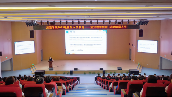 新校区,新学期,新征程。为帮助新生能更快转变角色,尽快适应新生活、新环境,激励大家以积极的精神面貌投入到大学校园学习和生活。9月5日晚,川酒学院直属党支部书记唐德兵在酒谷湖校区学术报告厅以“坚定理想信念 成就精彩人生”为题开展2023级新生入学教育第一课。学院团总支书记刘易娜、新生辅导员以及全体2023级同学参加了此次活动。