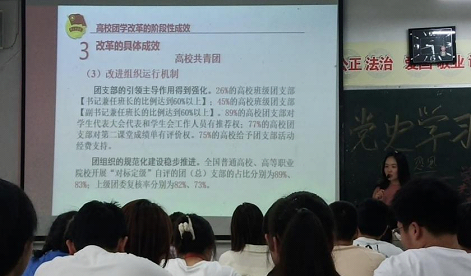 1921年到2021年,中国共产党走过了百年奋斗历程。百年中国沧桑巨变,百年大党胸怀千秋伟业、恰是风华正茂。中国共产党可歌可泣的百年历史,是共产党人前行的动力,是一部丰富生动的教科书。此次团课培训会集中观看了《重温党史》微视频。团总支书记苏双双结合“传承五四精神”讲述了“我为同学做件事”团组织生活会如何开展,指出了四月团组织生活会存在的问题,要求五月团组织“书香化院”读书会,学习一篇党史,分享学习心得。要求团干部要有责任感,把各部门、班级建设发展的更好,分析讲解了“团支部的作用与职能”、“团组织的规范化建设目标”、“高校团学组织的各自职责”,强调作为学生干部不仅仅只是老师的助手,更要提高独立思考、判断能力,为同学们服务。