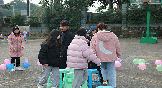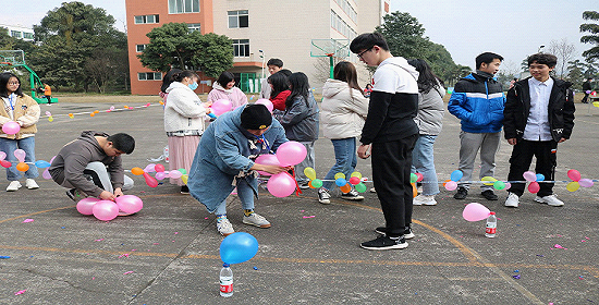活动正式开始,活动项目丰富多彩:踩气球、双人夹气球、转10圈、指压板连续跳绳、我比你猜、套圈、抢凳子、两人三足等项目,迎来了众多同学的参与,各个游戏区域都有不少同学排队等待,现场秩序井然有序。整个篮球场都洋溢着同学们的欢声笑语。