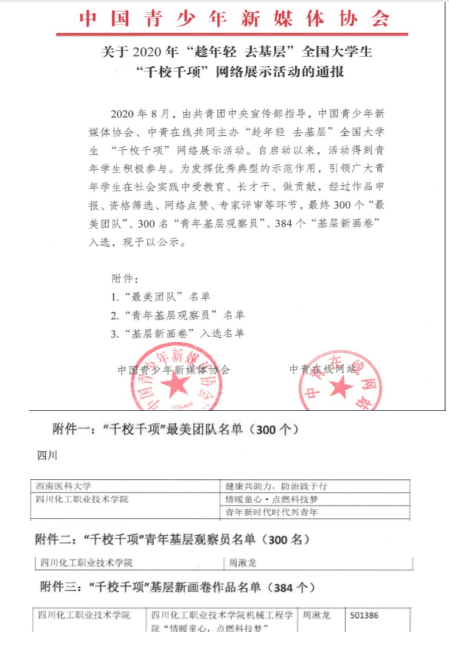 2020年暑期,由共青团中央宣传部指导,中国青少年新媒体协会、中青在线共同主办的“趁年轻,去基层”全国大学生“千校千项”暑期社会实践活动成功举办。全国共2000余所大中专院校、超过500万名大学生、25万多支实践队伍参与其中。