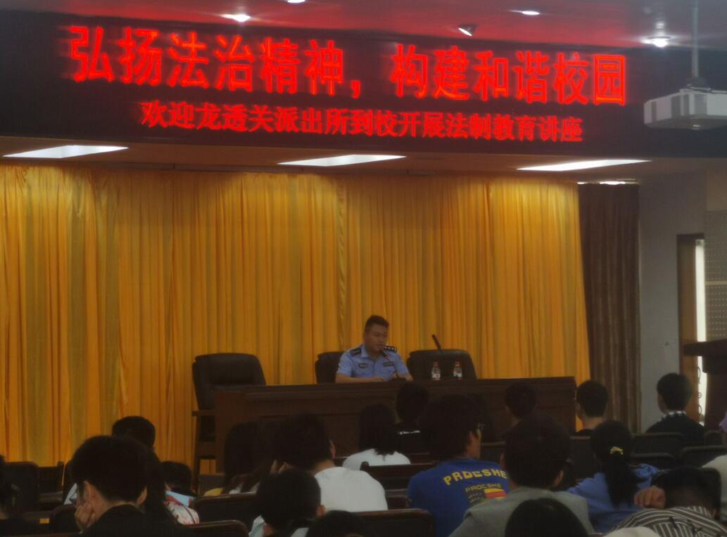 为提高我校学生的法律意识,大力弘扬法治精神,构建和谐校园。2020年9月22日下午,学校在行政楼五楼会议室举办了以“弘扬法治精神,构建和谐校园”为主题的法制进校园专题讲座。讲座特邀龙透关派出所丁副所长主讲,学校保卫处刑侦治安干事梅置敏主持。