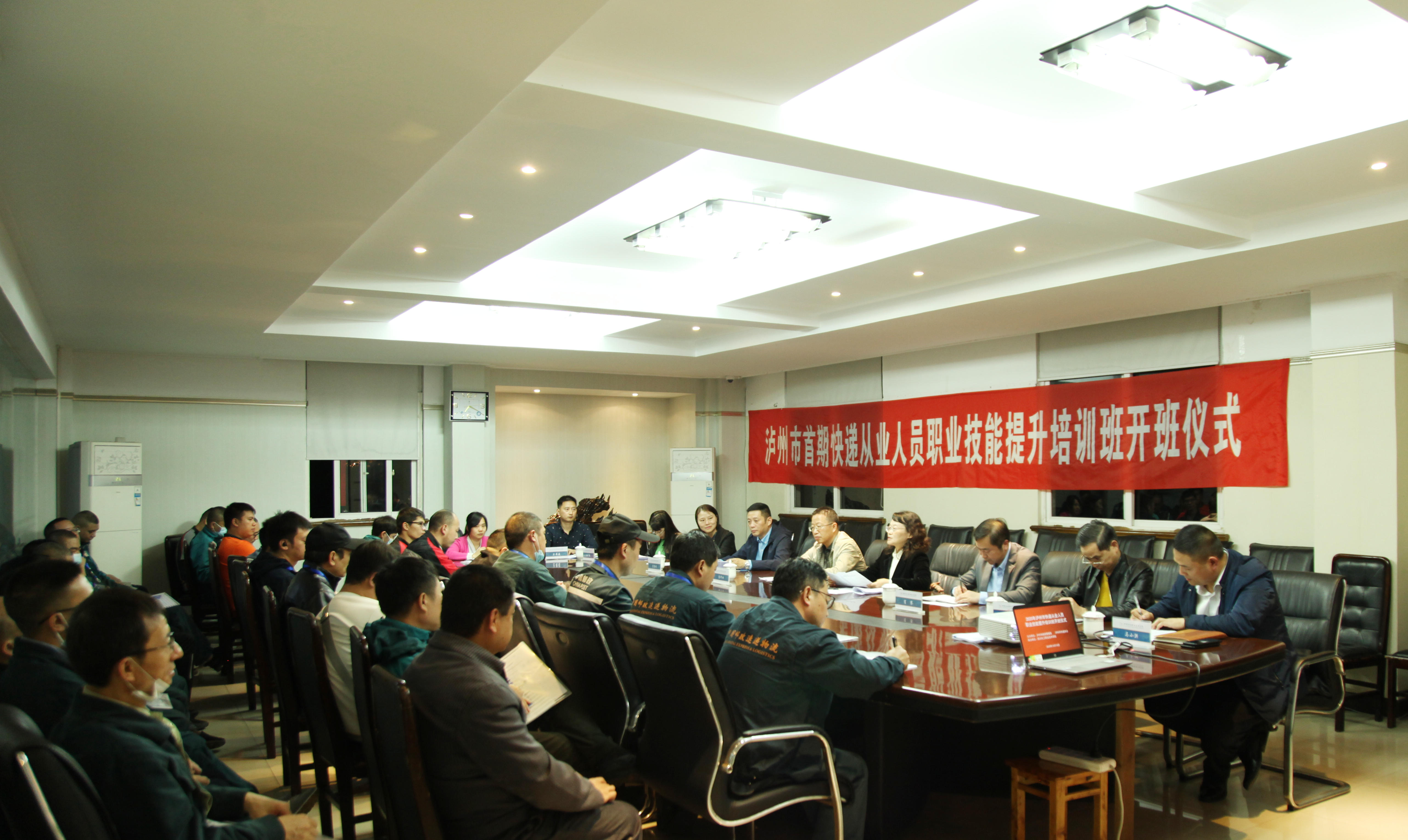 10月10日晚,2020年泸州市快递从业人员职业技能提升培训班开班仪式在学校行政楼301会议室隆重举行。泸州市邮政管理局党组书记、局长王艳飞,泸州市邮政管理局党组成员、行管科肖攀科长,泸州市邮政公司副总、快递协会会长宣哲明,学校蒲开伦副院长,经济管理学院张晋副书记、马小洪副院长及首批全体参训学员参加了开班仪式。