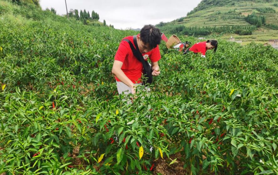 为响应四川省教育厅关于开展“青年红色筑梦之旅”电商直播活动的号召,经济管理学院结合学生专业特长,利用暑期社会实践活动,组织师生深入脱贫攻坚一线,开展电商直播活动,为全面建成小康社会贡献自己的力量。8月24日,经过三个小时的车程,经济管理学院暑期社会实践小分队抵达了叙永县摩尼镇金榜村,在我校驻村第一书记牟均的带领下,前往当地原生态辣椒地。