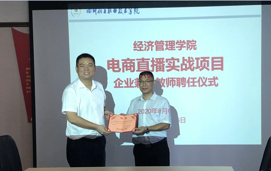 在洽谈前,经济管理学院为泸州斯特普网络科技有限公司总经理唐宁颁发了电商直播项目企业兼职教师聘书。