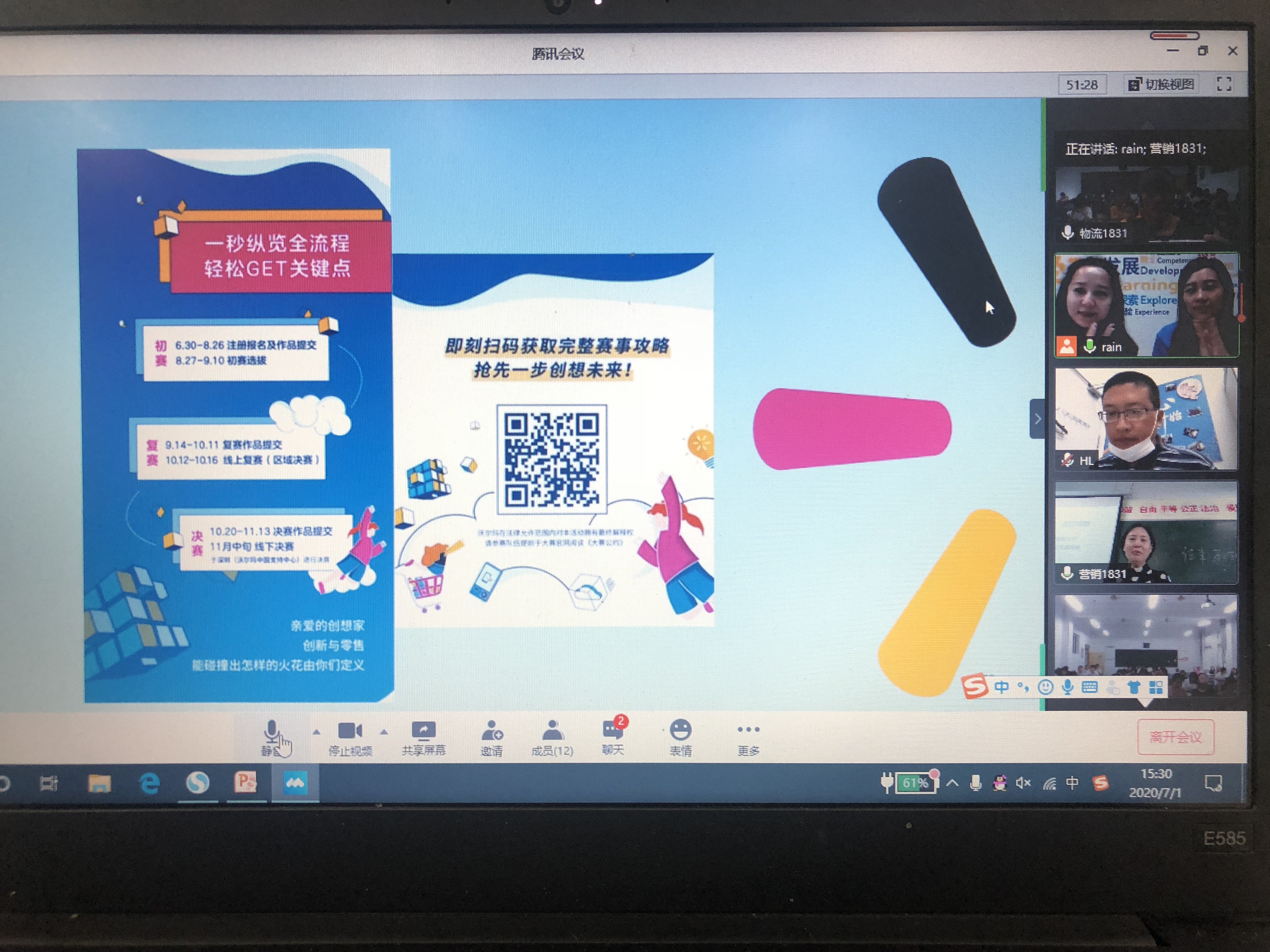 为了推进校企“云”端联动,共育职业人才,帮助学生了解疫情后的就业市场,对未来的就业有一个清醒的认识,2020年7月1日,经济管理学院联合沃尔玛中国四川区通过腾讯会议开展校企“云”端联动,共育职业人才暨经济管理学院2018级就业工作启动会。沃尔玛中国四川区自贡人力资源部经理倪壤女士和经济管理学院王兴莲老师共同主持了本次会议,经济管理学院专业教师、沃尔玛中国四川区宜宾、荣县人力资源部经理以及18级市场营销、物流管理、电子商务等专业同学在线上参加了本次会议。