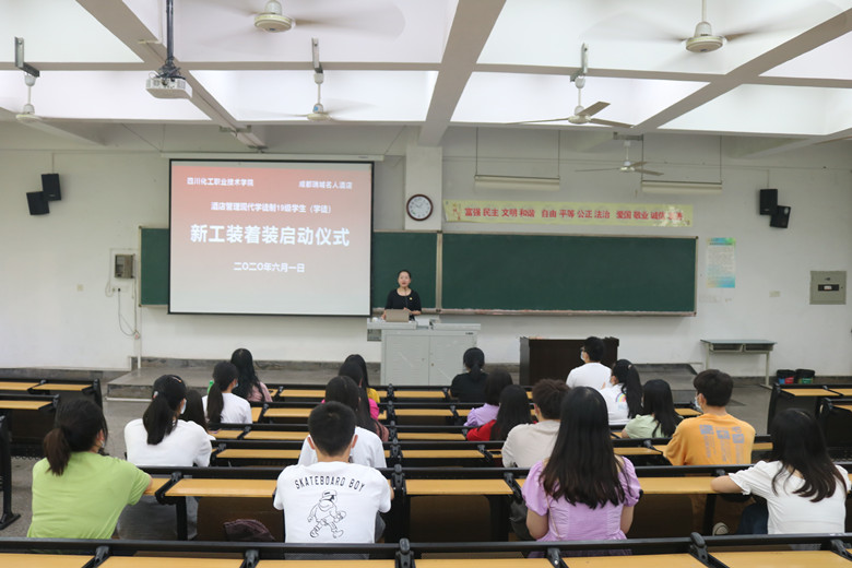 6月1日上午10点,经济管理学院酒店管理现代学徒制19级学生新工装着装启动仪式在实A108举行。成都瑞城名人酒店冯莉总监、学院招生就业处罗伦忠处长、经济管理学院党总支副书记张晋教授、经济管理学院马小洪副院长、酒店管理专业负责人宣雯娟老师及酒店管理(现代学徒制)1931班20名成都瑞城名人酒店学徒参加了新工装着装启动仪式。仪式由经济管理学院副院长马小洪主持。