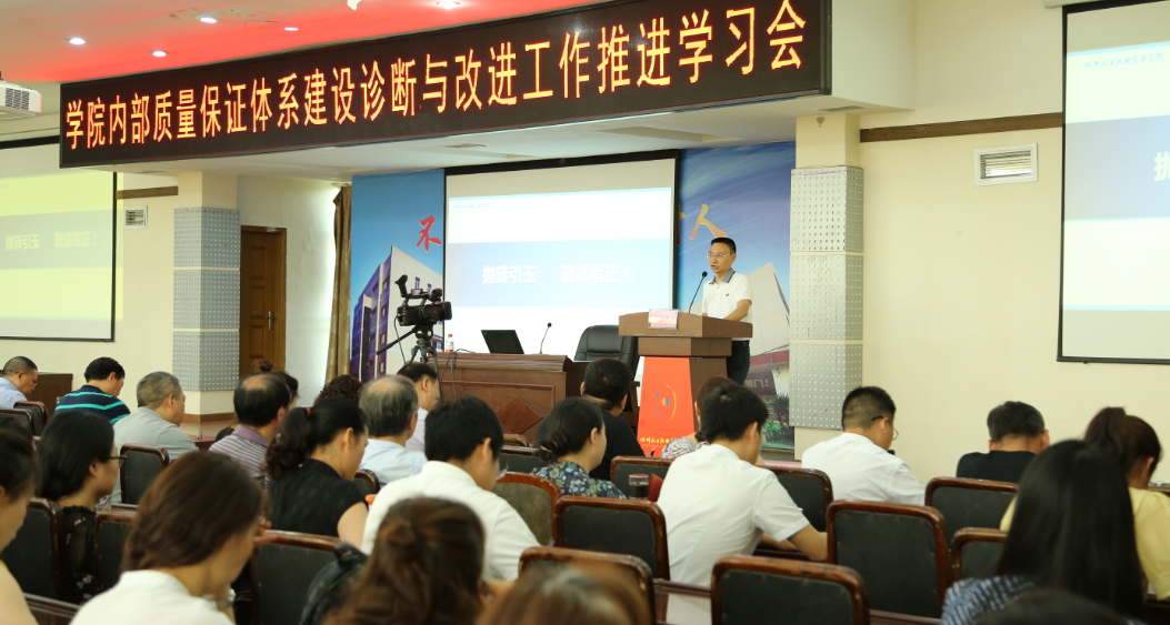 为推进内部质量保证体系诊断与改进工作,促进建立常态化内部质量保证制度体系、有序开展诊断与改进工作,2019年6月5日,学院召开了内部质量保证体系建设诊断与改进工作推进学习会。学习会由副院长王志斌教授主持,学院党政领导班子全体成员出席了会议,全院教职工参加了本次学习会。