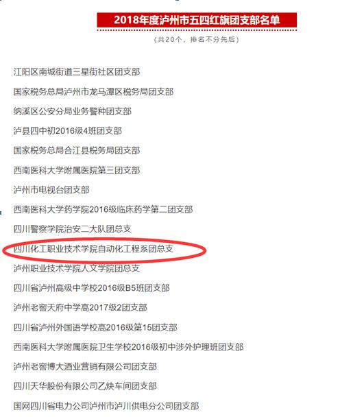 为表扬先进、树立榜样,共青团泸州市委在2019年4月组织开展了2018年度“泸州市五四红旗团支部”评选活动,我院自动化工程系团总支在历经材料申报、现场答辩等环节,最终荣获2018年度“泸州市五四红旗团支部”称号。