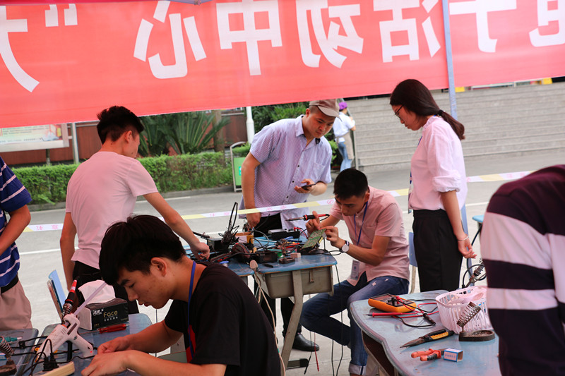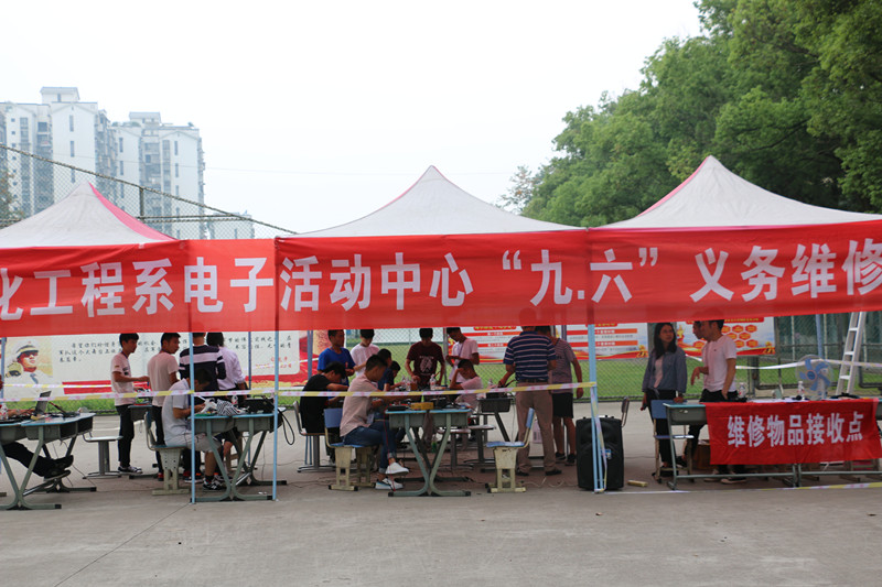 为提高学生专业技能水平,增强实际操作能力,进一步弘扬为人民服务、服务社会和奉献社会的精神,自动化工程系于2018年5月5日在学院食堂旁小操场成功开展专业特色电子电器“九·六”(第九周星期六)义务维修活动。自动化工程系主任陈昌涛,党总支书记廖寻真,副主任彭毅、李林鑫,团总支书记陈婷婷,专业教师秦洪、张家铭等到现场关心支持并作技术指导。