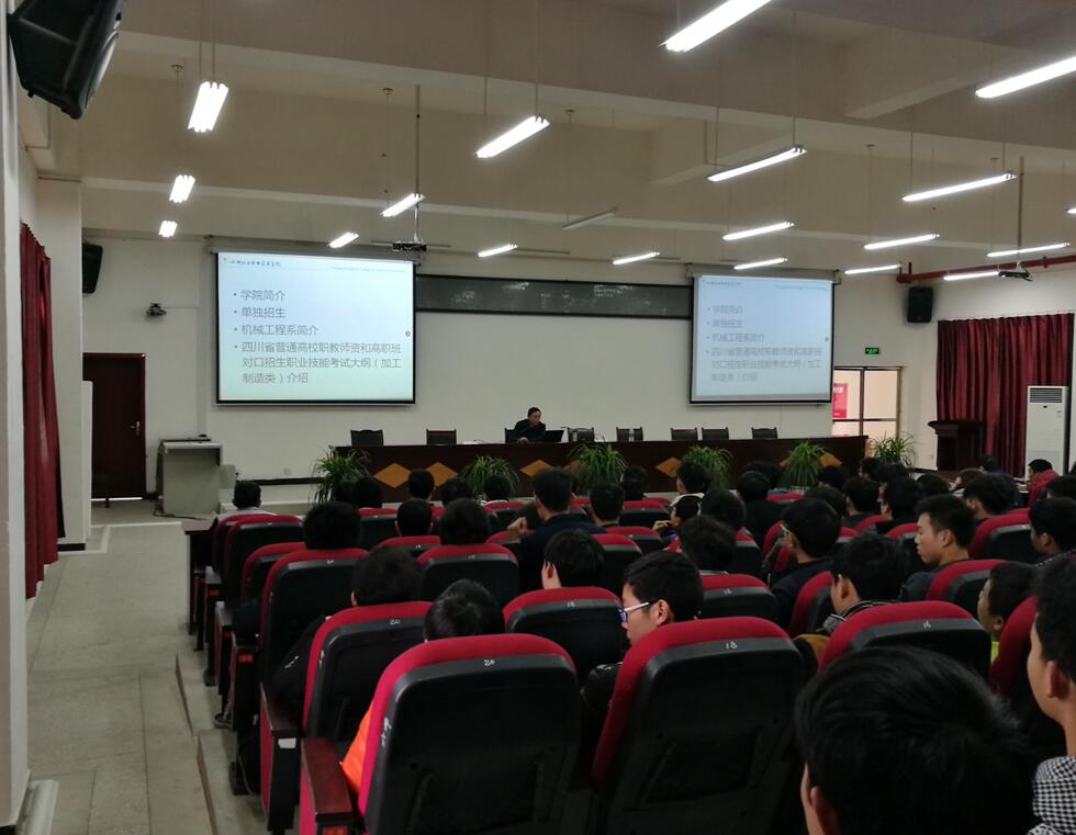 1月16日,应四川省苍溪县职业高级中学的邀请,学院后勤处负责人带队,机械系高朝祥、任小鸿一行三人到苍溪职中对该校师生进行省普通高校职教师资和高职班对口招生职业技能考试大纲(加工制造类)解读讲座。苍溪职中相关专业教师及近200名学生参加了此次讲座,讲座由苍溪职中副校长闫书贵主持。