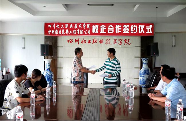签约仪式上,信息工程系主任李宏与黄涛总经理签署了《泸州维度装饰工程有限公司援建四川化工职业技术学院工艺展示间实训室协议》,学院王志斌副院长授牌泸州维度装饰工程有限公司为我院校外实训基地。仪式结束后,王院长就学院毕业生就业、顶岗实习等情况和黄涛总经理进行了深入探讨。