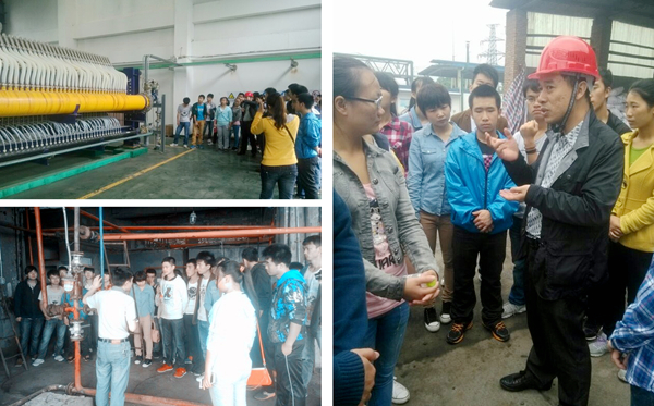 在化工厂区,同学们面对生产线,切身感悟到了书本知识与实践操作之间的区别,激发了大家浓厚的学习兴趣。特别是作为泸州化工行业中坚力量的鑫福化工厂,主要从事烧碱的生产。同学们在工厂杨经理的细心讲解下,完整地了解了相关产品的工艺流程。平时只存在于书本上和实验室里的化学原理,首次以产品加工的形式呈现在同学们面前,让大家大开眼界,收获颇丰。