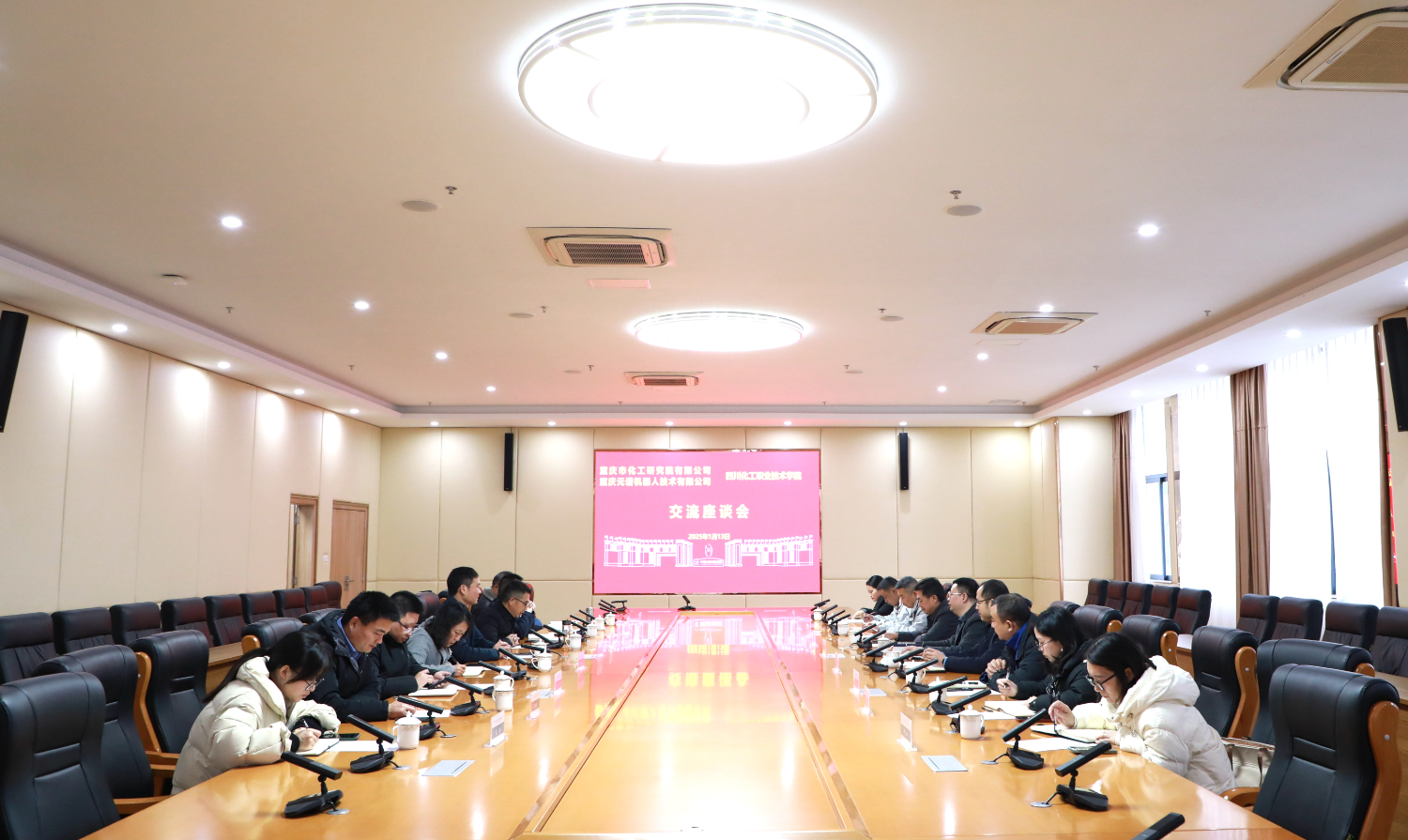 重庆市化工研究院有限公司科技发展部、办公室、人力资源部,重庆元谱机器人技术有限公司营业部主要领导,学校人事处、智能制造学院、科技处、对外交流与合作处、机械工程学院、应用化工学院相关负责人参加交流座谈会。