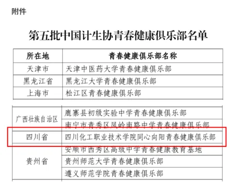近日,中国计划生育协会公布了“第五批中国计生协青春健康俱乐部名单”,本次全国共确定青春健康俱乐部48家,我校成为本年度四川省唯一获此殊荣的院校。