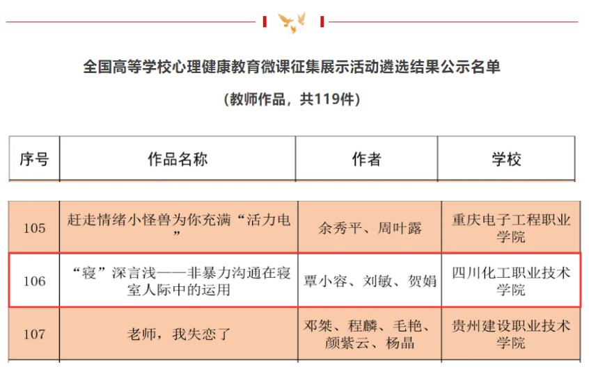 近日,由普通高等学校学生心理健康教育专家指导委员会主办的全国高等学校心理健康教育微课征集展示活动遴选结果揭晓,我校学生心理健康教育中心覃小容、刘敏、贺娟3位老师设计创作的心理微课《“寝”深言浅——非暴力沟通在寝室人际中的运用》成功入选,这也是四川省高职院校唯一入选作品。