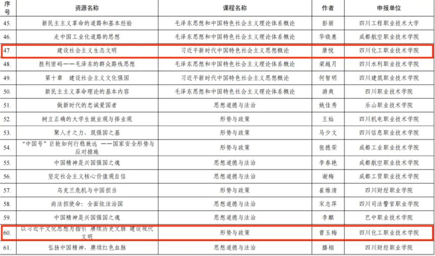近日,省教育厅下发了《关于公布入选四川省职业学校思想政治课程示范课名单的通知》,学校马克思主义学院曾玉梅讲授的《以习近平文化思想为指引 赓续历史文脉 建设现代文明》和唐悦讲授的《建设社会主义生态文明》共2门课程,成功入选全省100门2023年四川省职业学校思想政治课程示范课。