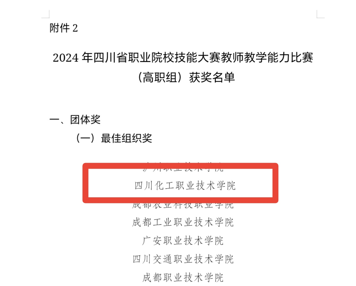2024年四川省职业院校技能大赛教师教学能力比赛于2024年7月11日至12日在成都纺织高等专科学校圆满落下帷幕。经过网络初评和现场决赛的激烈角逐,学校选送的9件参赛作品全部获奖。其中,荣获“一等奖”3项、“二等奖”3项、“三等奖”3项,学校荣获“最佳组织奖”。