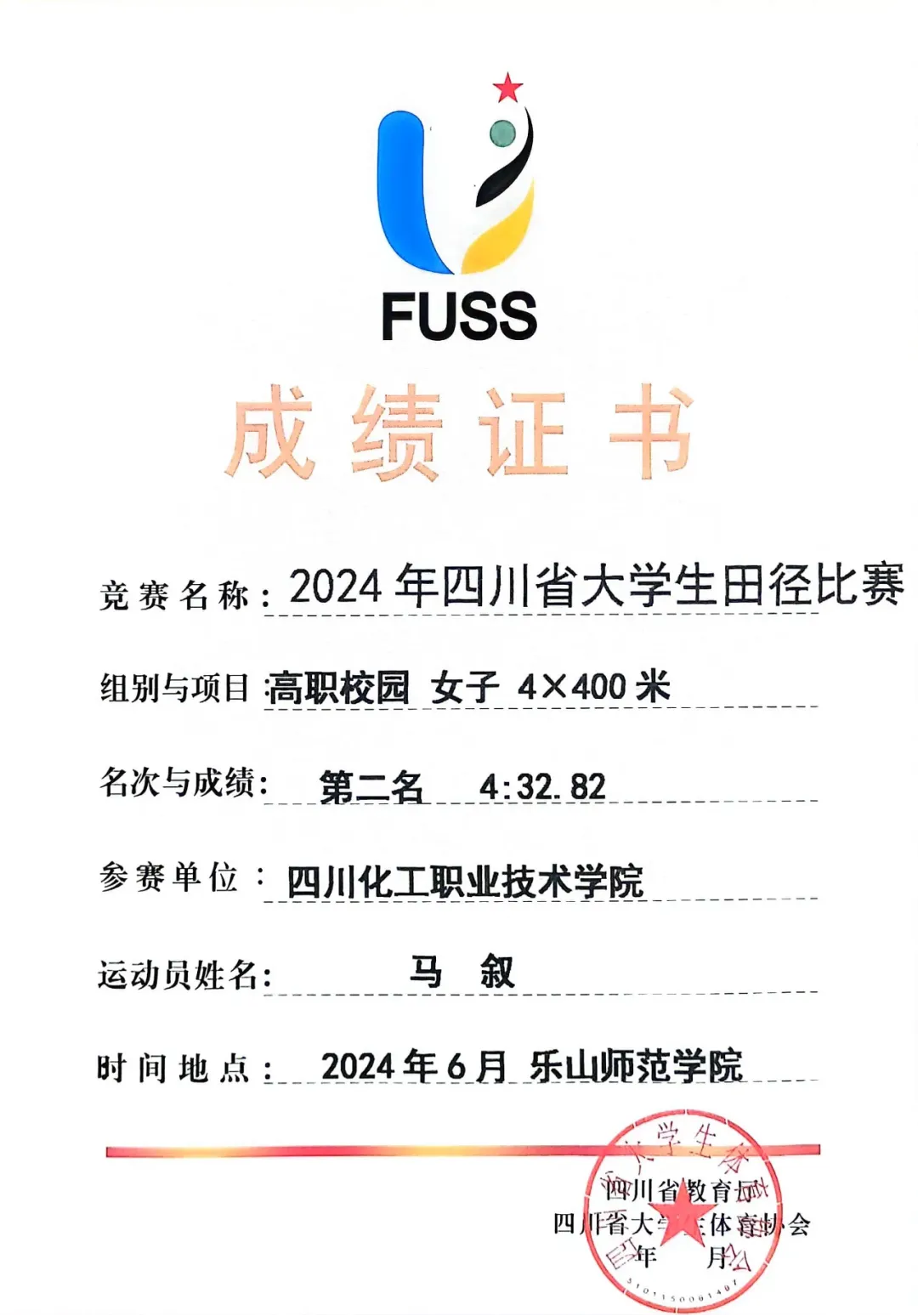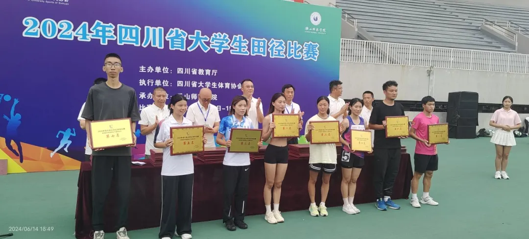 由四川省教育厅主办、四川省大学生体育协会执行的“2024年四川省大学生田径比赛”于2024年6月11日至14日在乐山师范学院和乐山市体育中心举行。此次比赛吸引了全省90多所高校的2000余名教练员和运动员参与。经过激烈角逐,学校田径队斩获了高职高专校园组团体总分第一名、男子团体总分第一名以及女子团体总分第四名,实现历史突破!
