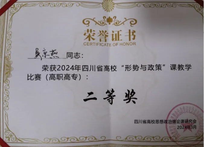 2024年3月29日—31日,由四川省委教育工委、四川省教育厅指导,四川省高校思想政治理论课研究会主办的2024年四川省高校“形势与政策”课教学竞赛在成都工业职业技术学院举行。学校马克思主义学院教师吴京燕的参赛作品《向“新”发力 汇聚高质量发展新动能》荣获“二等奖”。