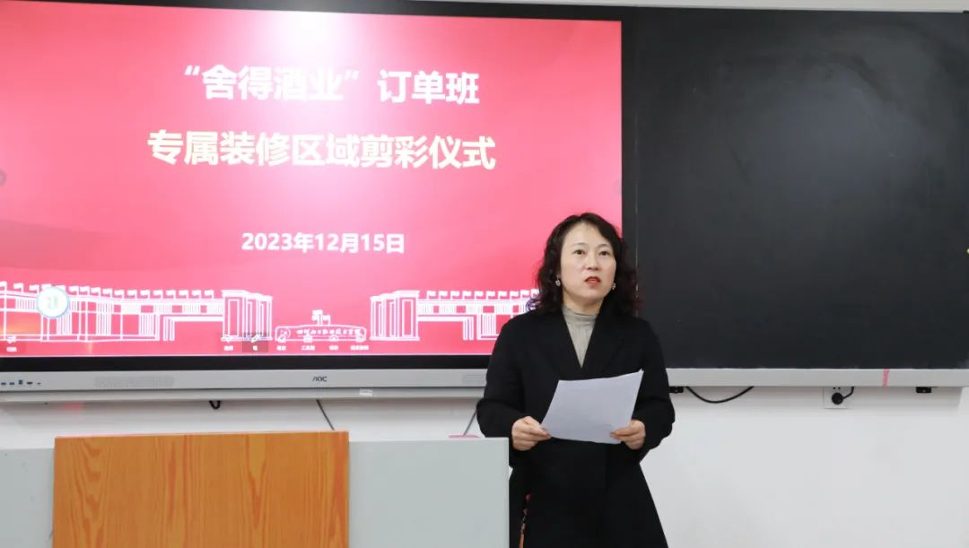 2023年12月15日上午,舍得酒业订单班专属教室剪彩仪式在学校酒谷湖校区醇学楼408教室举行。舍得酒业股份有限公司总裁助理赵鹏、人力资源中心副总经理闫德民,生产、技术中心副总经理龙远兵,学校党委副书记、院长文申柳,党委委员、副院长谢光杰参加仪式。仪式由学校党委委员、副院长徐丽萍主持。