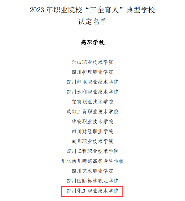 12月14日,四川省教育厅公布2023年职业院校“三全育人”典型学校认定结果,学校被认定为2023年职业院校“三全育人”典型学校。