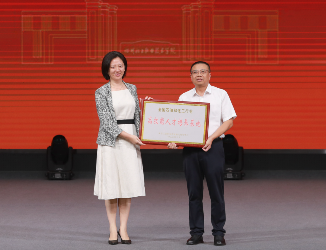 会上,学校被授予“全国石化行业高技能人才培养基地”。化学工业职业技能鉴定指导中心沈磊主任为学校授牌,学校副院长邓启华接牌。