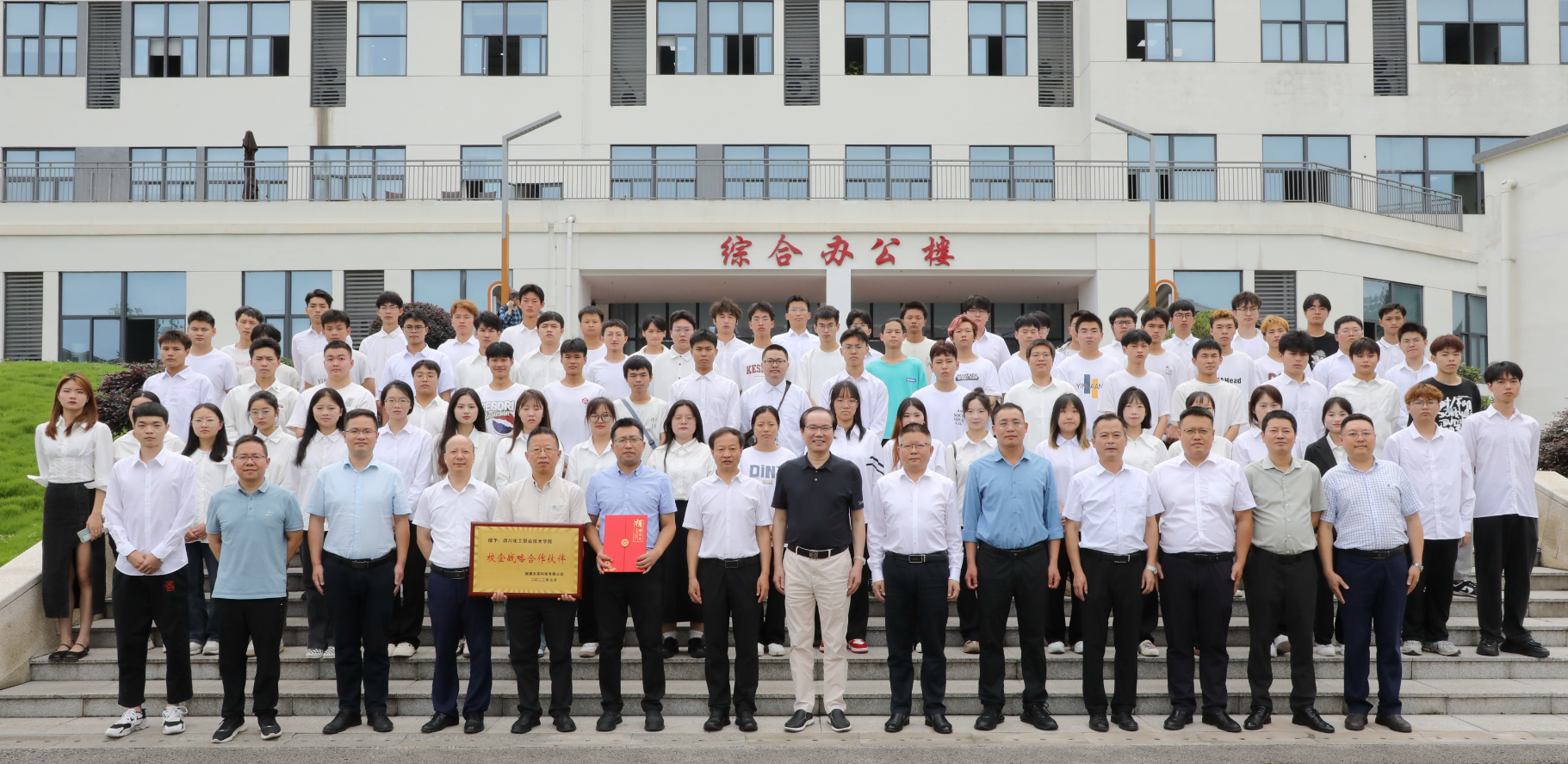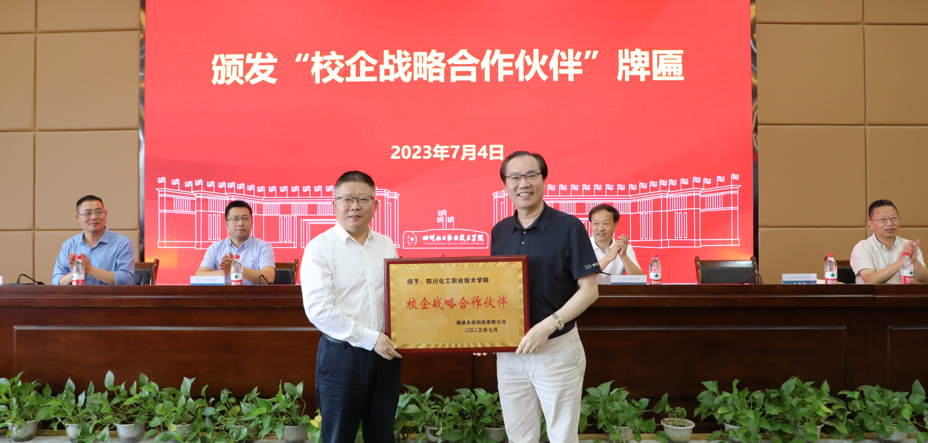 在与会人员的共同见证下,蒲开伦与杨微签订了第七届“永荣科技”校企合作协议,汪建根向文申柳颁发“校企战略合作伙伴”牌匾,文申柳向汪建根颁发“永荣林”捐赠证书。