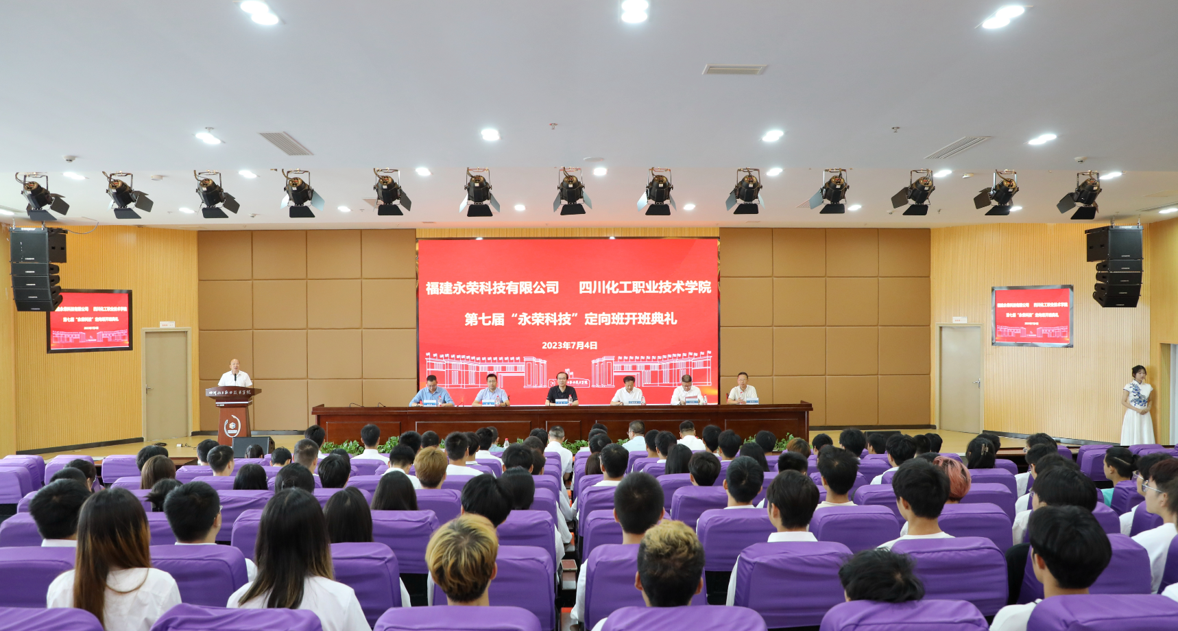 经过校企双方的共同努力,7月4日上午,第七届“永荣科技”定向班(公司为学生减免3年学费)开班典礼在学校护国校区图书馆四楼第二学术报告厅隆重举行。福建永荣科技有限公司董事长汪建根、人资行政副总经理杨微,学校党委书记刘志勇,党委副书记、院长文申柳,党委委员、副院长蒲开伦及95名第七届“永荣科技”定向班学员参加开班典礼。仪式由招生就业处(校企合作办)处长张宏主持。