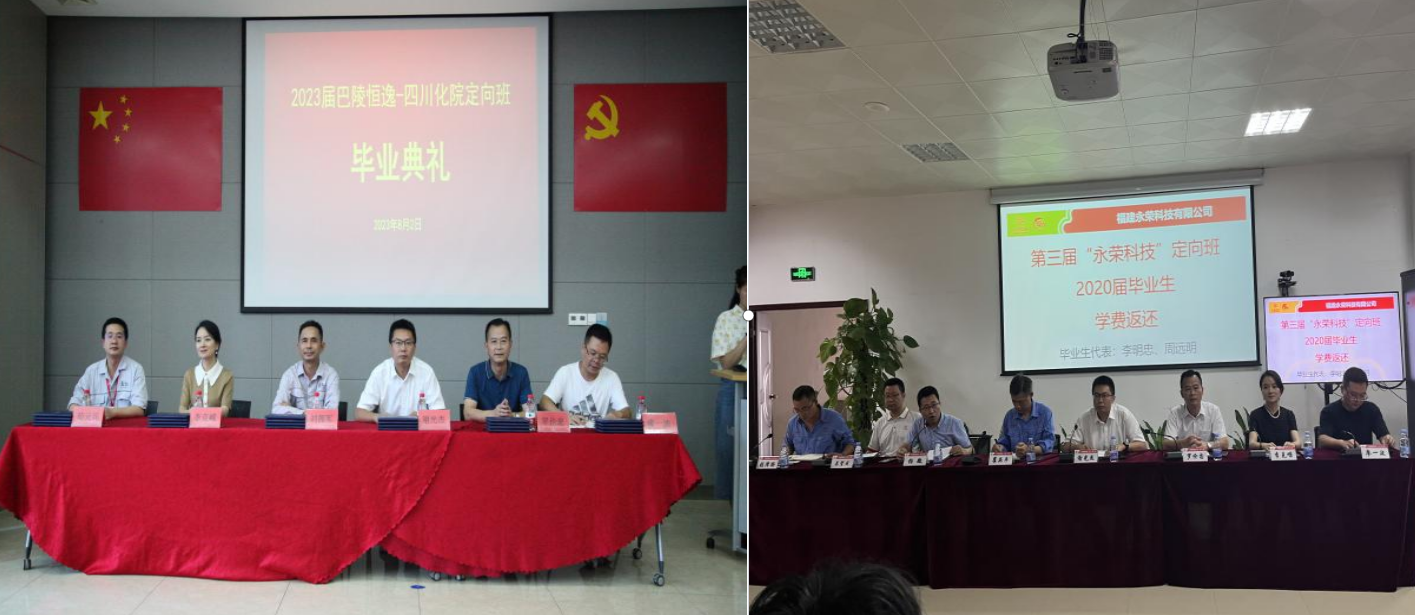 毕业典礼上,刘拥军感谢四川化院一直以来的大力支持和信任,感谢同学们为企业发展作出的贡献,他还分享了战斗英雄杨根思的“三个不相信”精神和钟南山院士的抗疫精神,勉励同学们立足岗位奋力拼搏,绽放人生精彩。瞿亚平表示,永荣科技是率先与学校开展定向班联合培养的企业,走出了校企合作的新高度、共同育人的新模式。要将实现公司战略规划和学生成长相结合,为同学们提供更好的环境和发展平台,让更多的优秀毕业生加入公司,积极工作,实现人生理想。