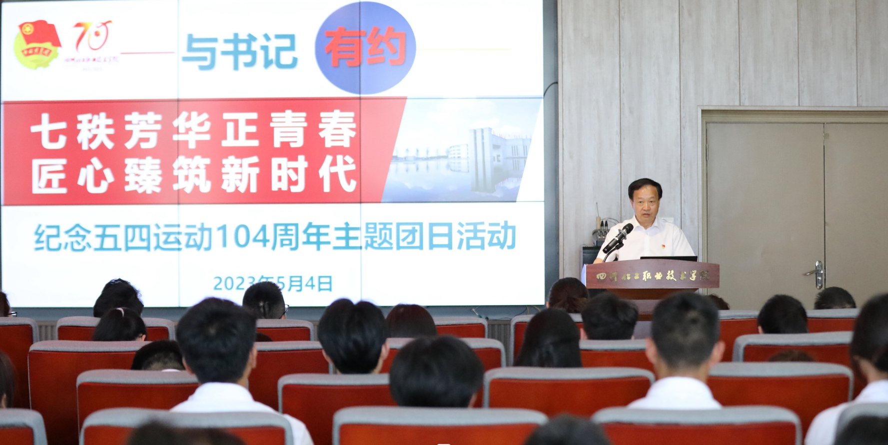 5月4日下午,与书记有约|“七秩芳华正青春,匠心臻筑新时代”纪念五四运动104周年主题团日活动在学校马克思主义读书会举行。学校党委书记刘志勇出席活动并讲话。党委委员、副院长谢光杰,党委宣传部、各二级学院主管学生工作负责人,校团委委员、各团总支书记、青年师生代表共70余人参加了活动。活动由校团委副书记(主持工作)张霞主持。