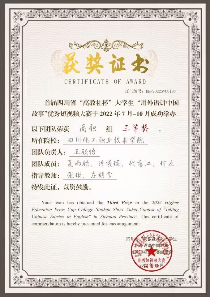 2022年7月——10月,由四川省教育厅主办,成都理工大学承办,四川省普通本科高校外国语言文学类专业教学指导委员会、高等教育出版社协办的首届四川省“高教社杯”大学生“用外语讲中国故事”优秀短视频大赛顺利举行。学校选送的三件参赛作品均荣获“三等奖”。