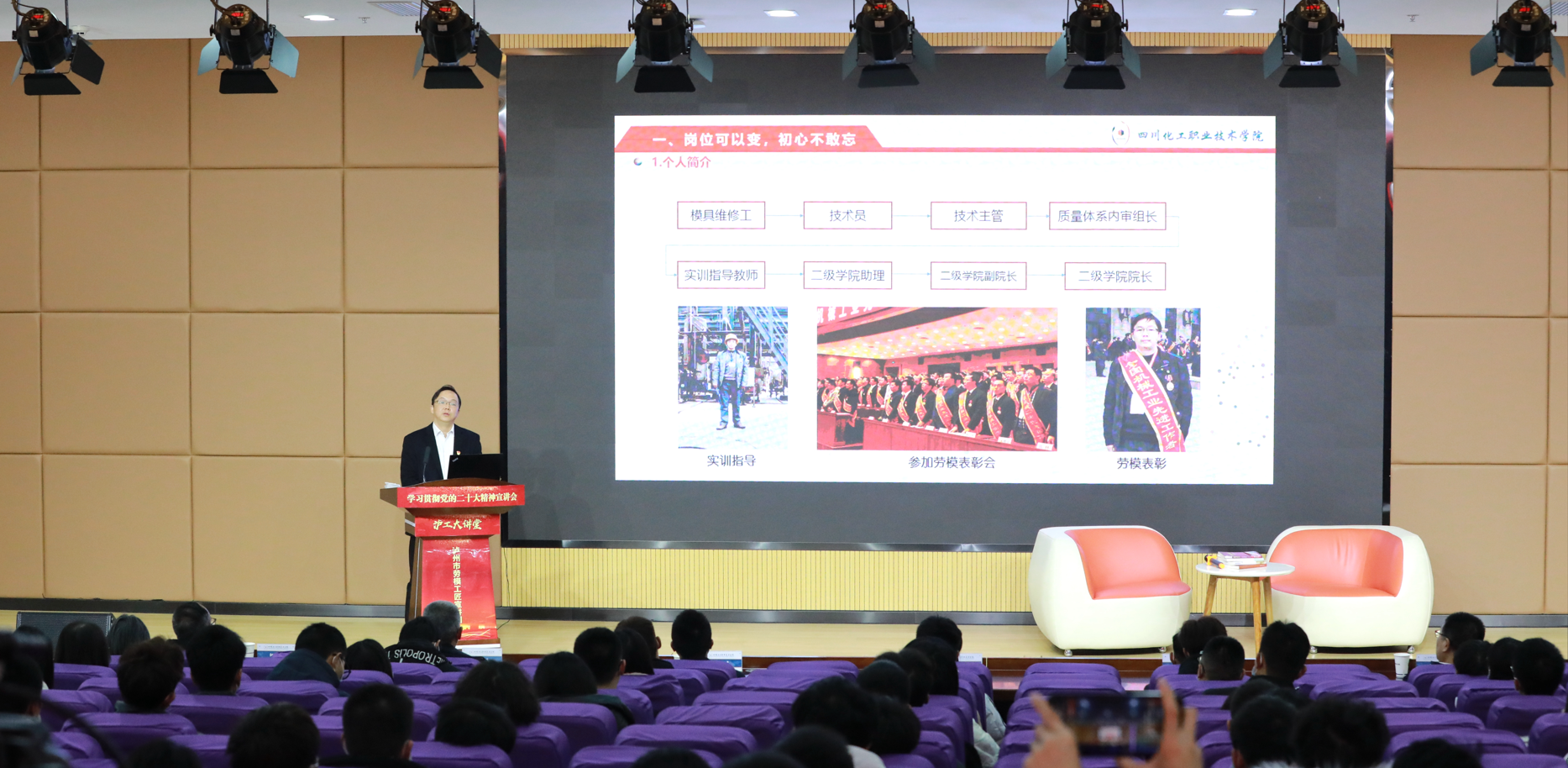 宣讲会上,全国机械工业先进工作者、学校机械工程学院党总支副书记、院长、高级工程师任小鸿,泸州职业技术学院教授、民政部科技领军人才颜功兴,四川工匠、全国技术能手、泸天化股份有限公司钳工班长陈杰,四川省劳动模范、四川新火炬化工有限责任公司高级技工邹学通4位宣讲人结合自身工作经历,宣讲了学习贯彻落实党的二十大精神的感受和体会,以“小故事”讲“大道理”,推动党的二十大精神入脑入心。他们用朴实的语言、生动的事例、真挚的情感将劳模精神、劳动精神、工匠精神娓娓道来,以强烈的责任担当、卓越的劳动创造、务实的创新精神,生动诠释了用平凡铸就伟大、用劳动创造幸福的新时代劳模工匠风采,激励学院师生认真学习文化知识,锤炼技能本领,勇担时代重任。