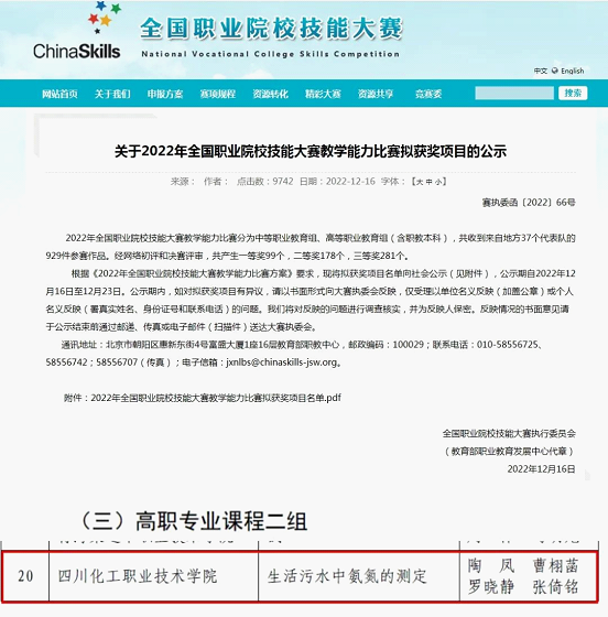 12月16日,全国职业院校技能大赛执行委员会公示了2022年全国职业院校技能大赛教学能力比赛拟获奖项目名单,学校陶凤、曹栩菡、罗晓静、张倚铭团队的参赛作品《生活污水中氨氮的测定》荣获高职专业课程二组“二等奖”。这是学校继去年获得国赛二等奖后的持续突破。